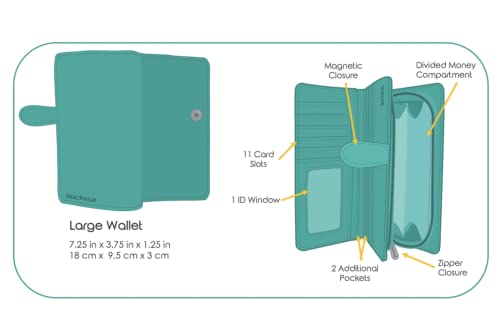 - Includes 11 card slots, 1 clear ID window, and full-length bill compartments. Magnetic snap closure and rear zippered coin pocket for secure storage.