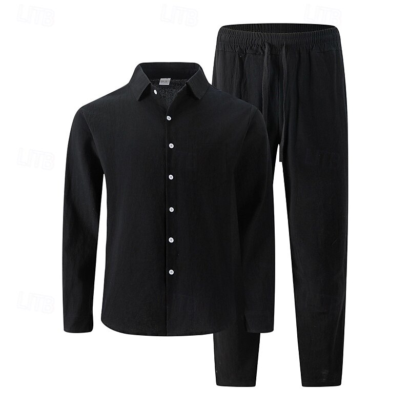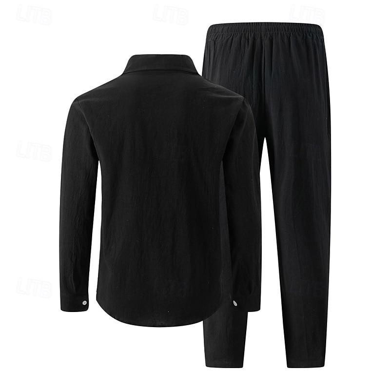 sizzling ! Men's Shirt Set Shirt Suits Shirt and Pant Sets 2 Pieces Outfits Long Sleeve Lapel Spring Fall Plain Fashion Casual 2 Piece Vacation Daily Wear Going out Black White Khaki Top Tee for Men