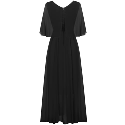 Women's Wedding Guest Long Dress Cocktail Party formal Cape Ruffle Sleeve Chiffon Lace Sequin Dress