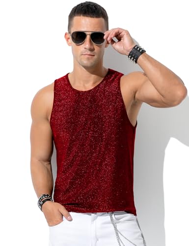 Fabric type: 75% Nylon, 20% Polyester, 5% SpandexCare instructions: Machine WashOrigin: ImportedFeatures a gold thread design that makes you shine brightly under the light, becoming the focal point.This rave tank top combines shiny material and soft lining for ultimate comfort.High elastic undershirts allowing you to move freely and stay contemporary. It's the ultimate party essential.The vest with a round neck design, highlighting your neckline and offering a unrestricted fit.From Halloween and rave nights to club parties, birthday bashes, Christmas celebrations, costume nights, and music festivals, the men's shiny tank top ensures you'll stand out and shine at any event. Perfect for everyday use. first-class materials and excellent craftsmanship ensure long-lasting durability.