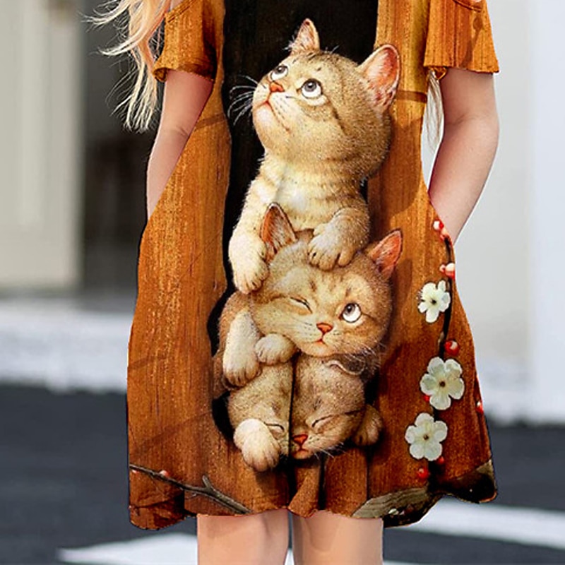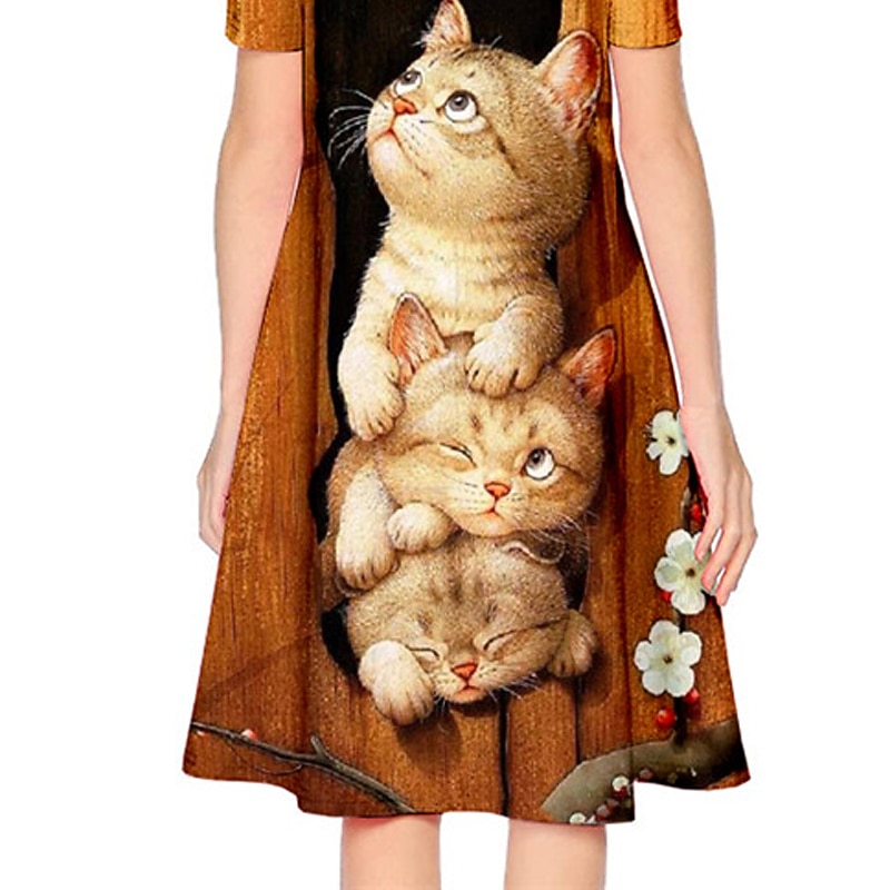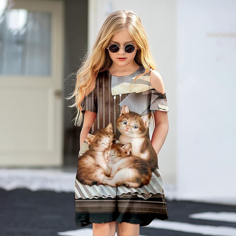 Girls' 3D Animal Cat Dress Short Sleeve 3D Print Summer Spring Vacation Daily Holiday Cute Casual Sweet Kids 3-12 Years A Line Dress Above Knee Regular Fit