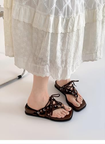 ZQW Women's Leopard Thong Sandals Studs Ankle Strap Low Heel Flip Flops Y2K Punk Edgy Open Toe Beach Slides Summer