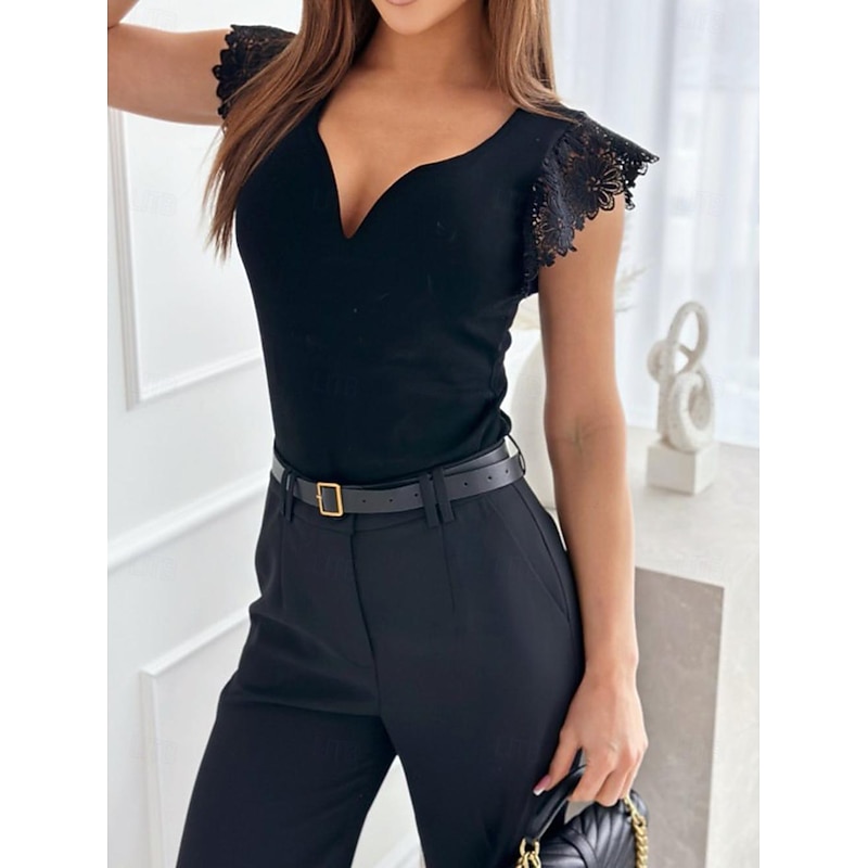 T shirt Tee Dressy Tops Women's Black White Plain Lace Street Daily Fashion V Neck Regular Fit S