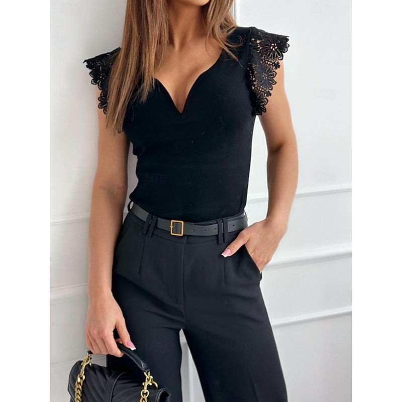 Highlights [Fabric]: Crafted from high-quality polyester, this top offers a soft and comfortable texture with micro-elasticity, providing a smooth and flattering fit that's perfect for summer days. It ensures both comfort and style for daily wear. [Fit]: The top features a regular fit, tailored to contour the body gracefully without being restrictive, making it a versatile piece suitable for both casual and dressy occasions. [Design Highlights]: With a sophisticated V-neckline and delicate lace cap sleeves adorned with floral patterns, this top exudes femininity and elegance. The plain yet chic design makes it an essential addition to any wardrobe, offering a contemporary flair. [Occasions]: Ideal for street and daily outings, this dressy top suits various events, whether you're heading to a casual lunch or a night out. Its stylish appearance and comfortable fabric make it a go-to choice for fashion-forward women. [Size Range]: Available in sizes S, M, L, and XL, this top caters to a range of body types, ensuring a perfect fit for everyone. Perfect for everyday use. first-class materials and excellent craftsmanship ensure long-lasting durability.