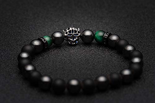 • ✓ Premium Materials and Design ➤ Features 8mm natural stony matte black onyx, magnetic hematite, and green tiger-eye crystal beads. Adorned with a ruthenium electroplated panther head and spacer piece, both inlaid with black zircon and highlighted with purple zircon eyes, giving the bracelet a distinctive and elegant look.