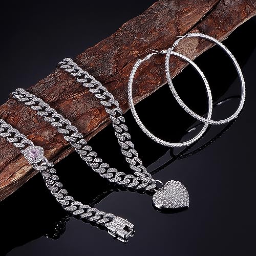 ORAZIO Cuban Link Chain Jewelry Set Cuban Chain Necklace Cuban Link Bracelet Rhinestone Hoop Earrings Gold/Silver Iced Out Chain Heart CZ Clear Cuban Link Chain Big Circle Earrings Hip Hop Cuban Link Chain For Women