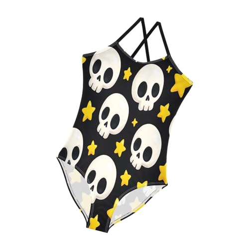 Cute White Skulls Yellow Stars Girls Swim Suit with Adjustable Shoulder Strap, Beach Swimsuit, 3-10