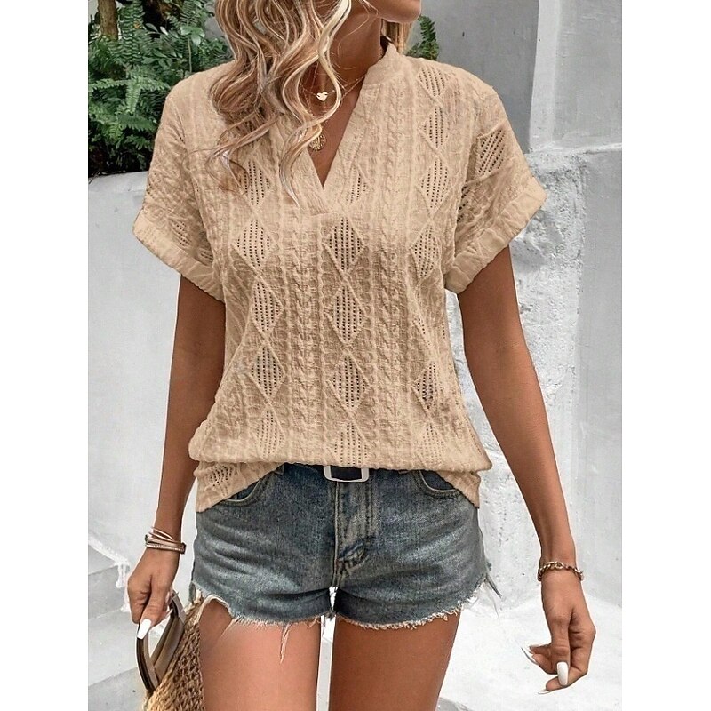 HOT ! Women's T Shirt Plain Fashion Modern Casual Short Sleeve V Neck Regular Tops Daily Weekend Eyelet White Pink Sky Blue Khaki Summer Spring