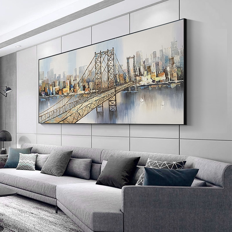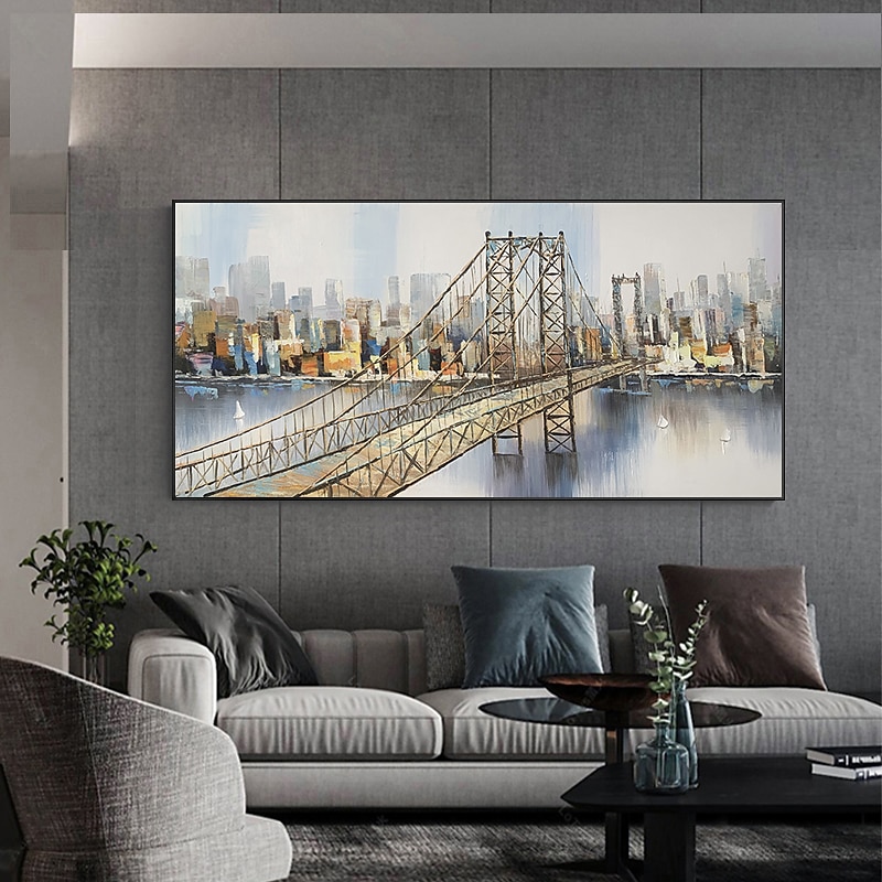 HOT ! Handmade Oil Painting Canvas Wall Art Decor Original City Iron Bridge Painting Abstract Architecture Painting for Home Decor Rolled Frameless Unstretched Painting