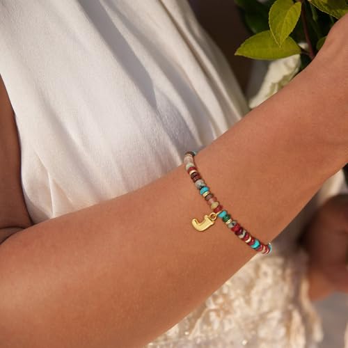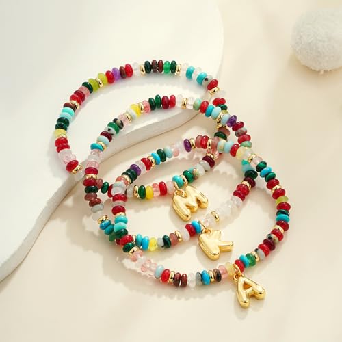 Beaded Initial Bracelets for Women, 14K Gold Plated Initial Letter Charm Rainbow Gemstone Colorful Summer Beach Jewelry for Women