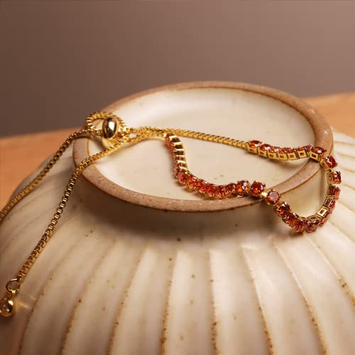 Material: Stainless SteelMetal type: Stainless SteelClasp type: SlideChain type: Box ChainGem type: Cubic ZirconiaThis classy fashionable hand jewelry has a minimalist dainty elegant design. Each crystal cubic zirconia rhinestone sparkles vividly. Sliding knot adjustable from 3.6” to 6.5”, end with two cute bezel setting CZ tails.This tennis chain bracelet is cozy and easy to wear. Free wrist size that fits most people, which makes it nice gift idea. Such brilliant sparkling accessories are great for both party and work, or even for daily.Gold plated brass, hypoallergenic, durable and fade resistant. Garnet ruby orange red gems are attractive and charming color that is timeless fashion for every ladies.These are gorgeous gifts for girlfriend, best friends, wife, mother on special days like Birthday, Valentine’s Day, Celebration Ceremony, Thanksgiving, Anniversary, Christmas, New Year, Graduation, Wedding, etc.These charming necklaces are really worth keeping. Proper storage and regular cleaning can help the jewelry stay shiny, and long-lasting. Perfect for everyday use. premium materials and excellent craftsmanship ensure long-lasting durability.