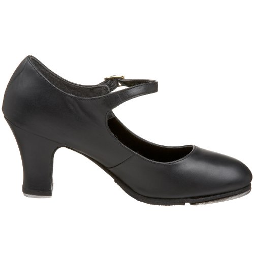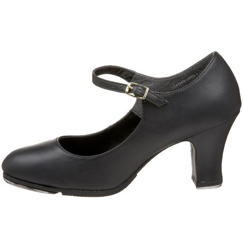 - Mary jane tap shoe featuring leather-wrapped contoured heel in mid height with leather top lift