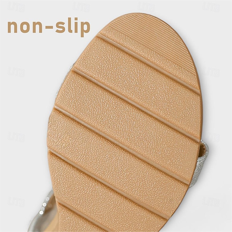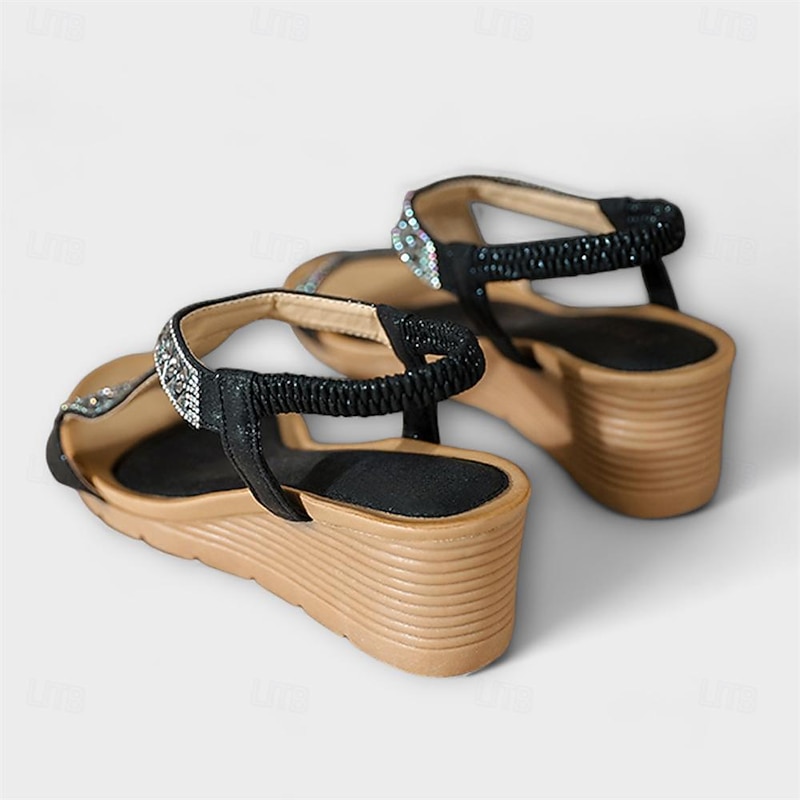 Highlights [Fabric and Design:] These women's sandals are expertly crafted from high-quality microbial leather, offering both elegance and durability. The wedge sole is made from lightweight rubber, providing a comfortable and reliable base for every step. [Style and Fit:] With a chic platform and wedge heel design, these sandals boast a trendy T-bar strap adorned with dazzling rhinestones, adding a touch of sparkle and sophistication. The elastic band ensures a secure fit while maintaining flexibility and ease of wear. [Design Highlights:] The intricate beadwork and rhinestone embellishments elevate the sandals' bohemian charm, making them a standout choice for sunny, contemporary occasions. The open-toe design not only facilitates breathability but also adds modern flair to your summer wardrobe. [Occasions:] Perfect for beach vacations, casual outings, and other relaxed settings, these sandals are versatile enough to complement both casual and more dressed-up ensembles. Whether you're strolling along the shore or attending a summer gathering, they add a stylish touch to any outfit. [Size Range:] Available in a wide range of sizes from US5 to US12, accommodating various foot shapes and ensuring a perfect fit for all-day comfort. Perfect for everyday use. first-class materials and excellent craftsmanship ensure long-lasting durability.