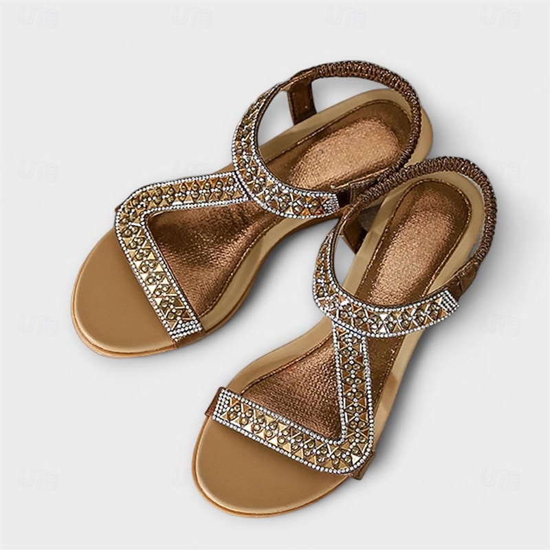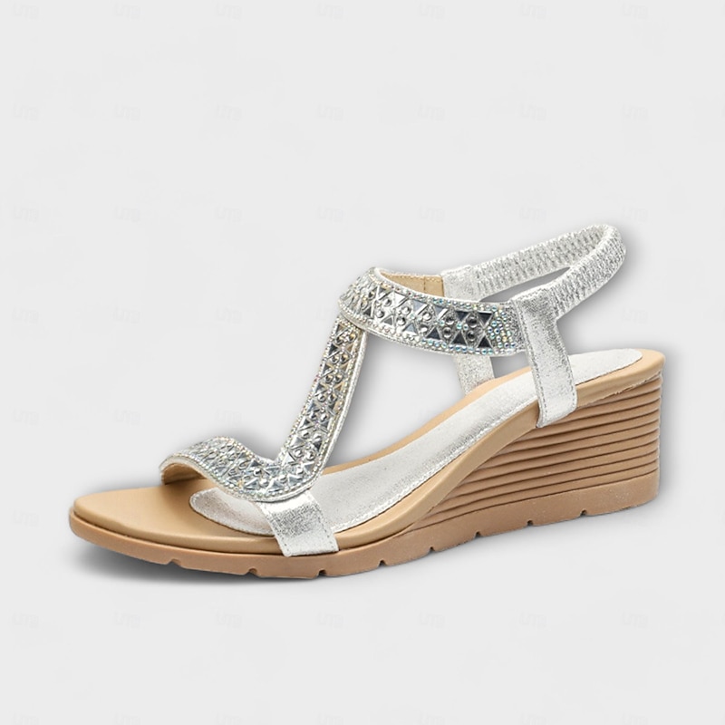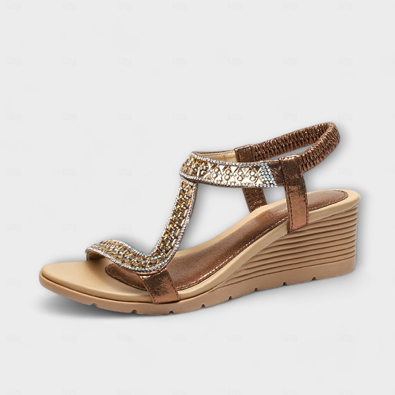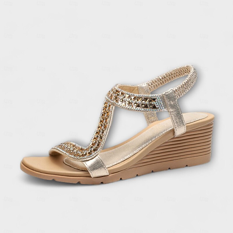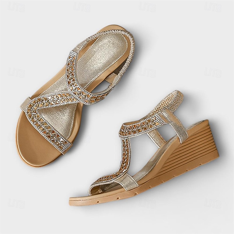 Women's Bohemian Rhinestone Wedge Sandals – Glamorous Beaded Elastic Strap Sandals for Summer Beach & Casual Wear