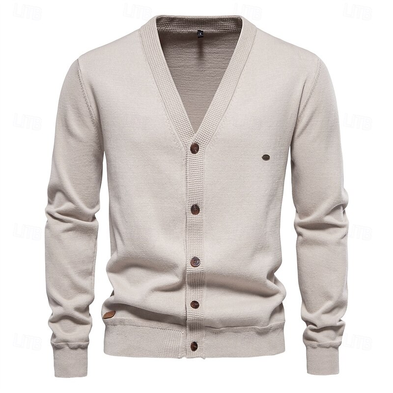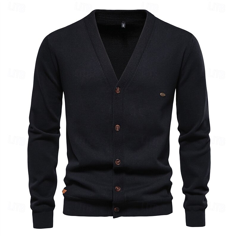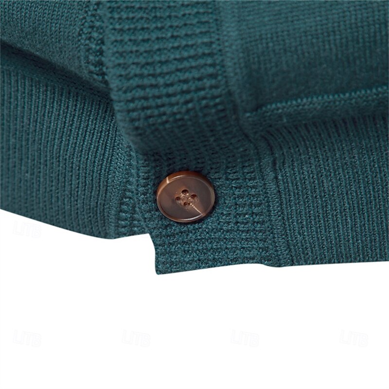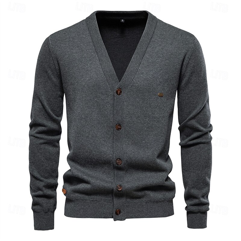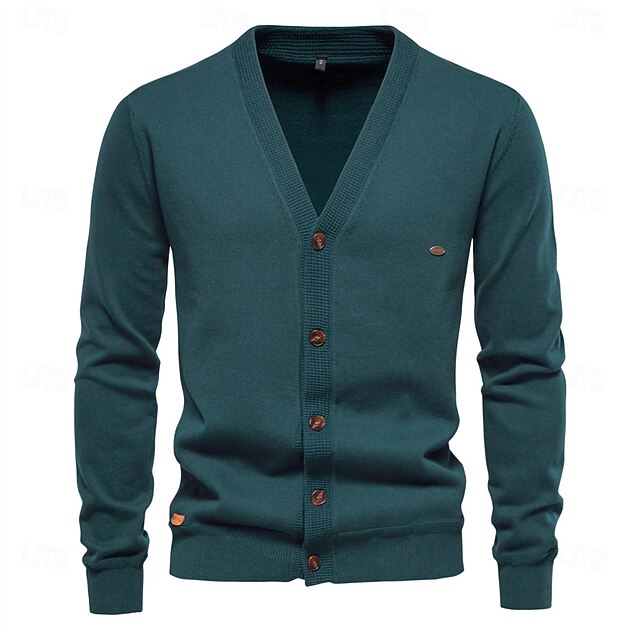 Highlights [Fabric] This men's cardigan sweater is crafted from a blend of elastane and 95% cotton, delivering a soft, micro-elastic texture that ensures comfort and flexibility. The fabric is perfect for the fall and winter seasons, providing warmth while remaining breathable. [Fit] The sweater is tailored in a form fit silhouette, offering a comfortable yet refined appearance. The ribbed cuffs and hem contribute to a snug fit, maintaining its shape and style over time. [Design Highlights] Featuring a fashion-forward turn-down collar and a iconic V-neck design, this cardigan includes a shawl style that adds a touch of elegance. The deep teal color is complemented by contrasting brown buttons, enhancing the overall aesthetic. A subtle logo detail on the chest provides a hint of branding. [Occasions] Ideal for casual daily wear, this cardigan is suitable for both relaxed and semi-formal settings. Its classic style makes it versatile, perfect for layering in cooler weather or wearing on its own during fall and winter. [Size Range] Available in a wide range of sizes to accommodate different body types, from S to XXL. The variety of colors such as Green, Black, Beige, Dark Navy, Dark Grey, and Light Grey allow for options that suit personal preferences. Perfect for everyday use. first-class materials and excellent craftsmanship ensure long-lasting durability.