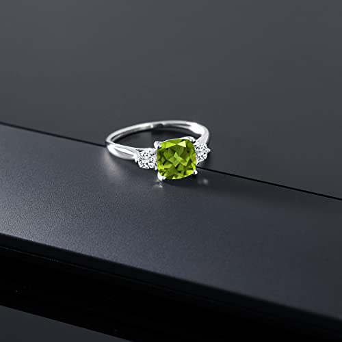 Gem Stone King 1.96 Cttw 10K White Gold Green Peridot and White Moissanite 3-Stone Engagement Ring | Cushion 7MM and 3MM | 3 Stone Wedding Anniversary Promise Ring For Women