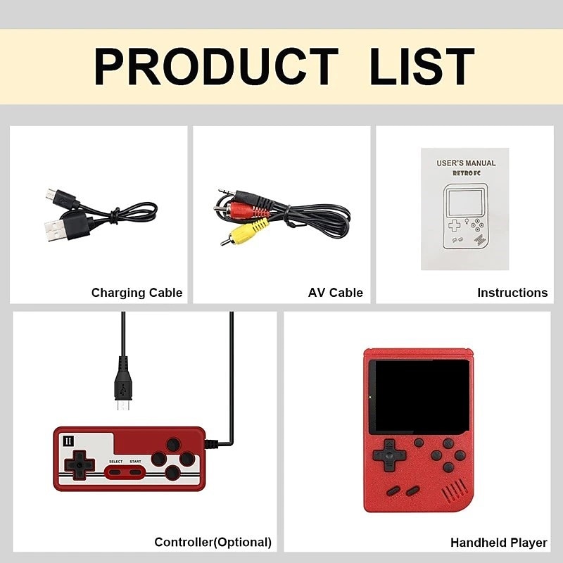 Highlights Handheld Game Console Built-in 800 Classic Games The game console has 800 one-of-a-kind classic FC games, take you back to the fun of childhood. With 3.0 inch screen, ultra slim and compact design, mini enough for you to carry out. Support two player mode by connecting gamepad, you can play with your partner. Built-in 800 classic games This game console built-in 800 different classic games. Includes sports, adventure and puzzle games as well as thinking and learning games involving memory, math, and logic. It will always have something new to amuse while you little love are at home or on the go. Support 2 Player Mode (Requires Gamepad) You can play with your partner by connecting game controller. One can play with the handheld console, the other one can play with the joystick, completely relax and experience. team work. Support TV Connection Digital multi-platform device, you can play on TV which has AV OUT interfaces for a better gaming experience. 80cm AV cable is included in the package. Rechargeable Battery Last for 7 Hours This handheld console comes with 1020mAh rechargeable lithium battery, more than 7 hours of battery life. When you are on a business trip, traveling, camping, you don't have to worry about running out of power. 3.0-Inch Screen High Definition Display 3.0-inch high definition display, ensuring portability, while also taking into account the comfort of the games. Not too bulky or too small. Tailored for children, Of course, as an adult gamers also can find pleasure in it. Portable and Easy to Carry Ultra slim and compact design, mini enough for you to carry out. Suitable for killing time on travelling outside. Ergonomic Design The casing is made of a strong and environmentally friendly plastic. Surface frosted, anti-fingerprint anti-scratch.After a long period of practical use testing, it is enough to withstand the violence of children. We promise that if it accidentally breaks within a month, please send us an email and we will renew it for free. High Sensitive Button All game player has passed the strict repeat keystrokes test, ensure the good performance of the buttons, provide stability and basically zero game delay. High sensibility and accuracy action button, give you the fastest gaming experience. Cable Length Color Display Package Includes 1x Charging cable 1x AV cable 1x Instruction 1x Controller(Optional) 1x Game player Perfect for everyday use. first-class materials and excellent craftsmanship ensure long-lasting durability.
