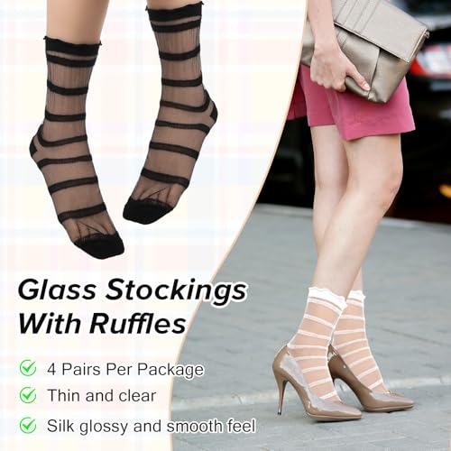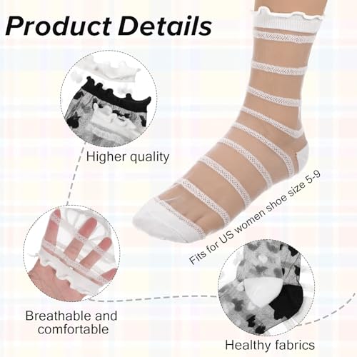 4 Pairs Sheer Socks, Lace Heart Socks Black Ruffle Ankle Sock for Women Transparent Heart Stripe Stocking Mesh Lace Hollow Stockings Thin White Stripe Sock for Summer Breathable Elastic