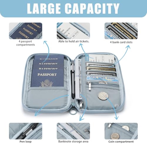 Travel Passport Wallet, Large Family Passport Holder for Men Women RFID Passport Cover Lightweight Portable Document Organizer with Wrist Strap & Neck Lanyard (Blue)