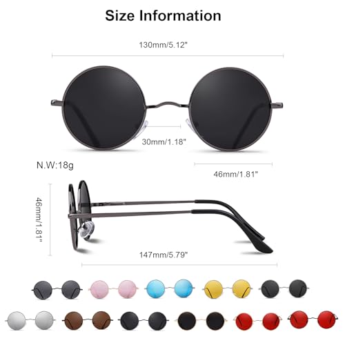 Origin: ImportedEYES PROTECTION & NATURAL SIGHT - The retro small round polarized sunglasses black with HD POLARIZED LENSES and UV400 RATED TECH, can effectively reduce glare reflected of roads, bodies of water, snow, and other horizontal surfaces, and restore the true color, also block 100% harmful UVA/UVB RAYS and protect your eyes against long-term UV damage. These retro polarized round sunglasses are protective and affordable, could be used as a driving glasses or other outdoor activities shades.VINTAGE ROUND DESIGN - The black polarized circle sunglasses are original from the legendary but upgraded in some points.These classic round cirlce sunglasses use the new metal spring hinges to make sunglasses could fit most face shapes.Colorful frame and mirrored reflective lenses make the integrated design cool and stunning. Top soft silicone nose pads reduce pressure and maximize the wearing comfort.All details will make you keep in love with this style steampunk sunglasses.NOT TOO BIG β NOT BIG LIKE AS OTHER ROUND SUNGLASSES, OURS ARE SMALLER AND FIT PERFECTLY. DIMENSION - Lens Width: 46mm(1.81inches) | Lens Height: 46mm(1.81inches) | Temple Length: 147mm(5.79inches) | Nose Bridge: 30mm(1.18inches)ENJOYING & SHARING - These tiny circle sunglasses black are always in trend and use sharing is everywhere. With exceptional quality, performance and comfort, these womens mens polarized sunglasses are great for daily and outdoor activities use,like driving, travling vacation or used as party, cosplay costume accessories.QUALITY GUARANTEE - If you have any problems retro round polarized sunglasses ,please feel free to contact us via amazon email. We will replace a new one or refund you FULL at once if sunglasses has flaws. Perfect for everyday use. premium materials and excellent craftsmanship ensure long-lasting durability.