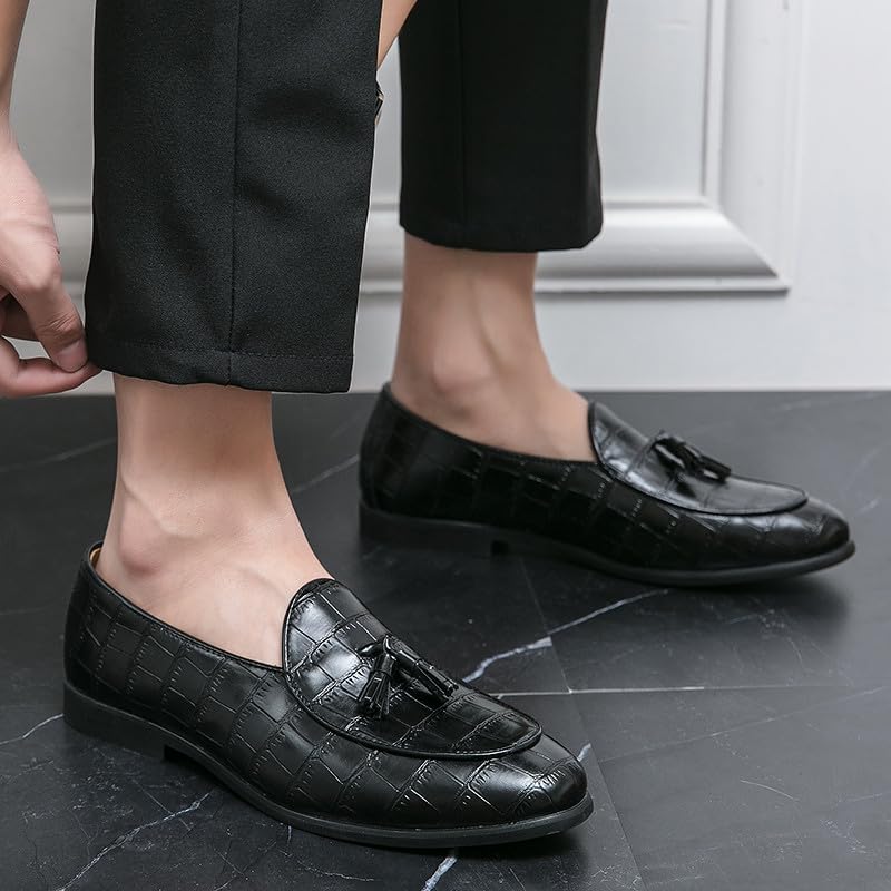 Origin: ImportedSole material: RubberOuter material: Faux LeatherClosure type: Pull-OnDESIGN: Classic tassel loafers featuring crocodile pattern embossing and sophisticated stitching details for a luxurious appearanceMATERIAL: Premium faux leather construction with a comfortable interior lining and durable rubber outsole for long-lasting wearVERSATILITY: Available in black and brown colors, perfect for both formal occasions and casual business settingsCOMFORT: Low-heel design with cushioned footbed provides all-day comfort and easy walking experienceSTYLE FEATURES: Decorative tassel accent and moccasin-style stitching create an elegant silhouette suitable for present-day gentlemen Perfect for everyday use. first-class materials and excellent craftsmanship ensure long-lasting durability.
